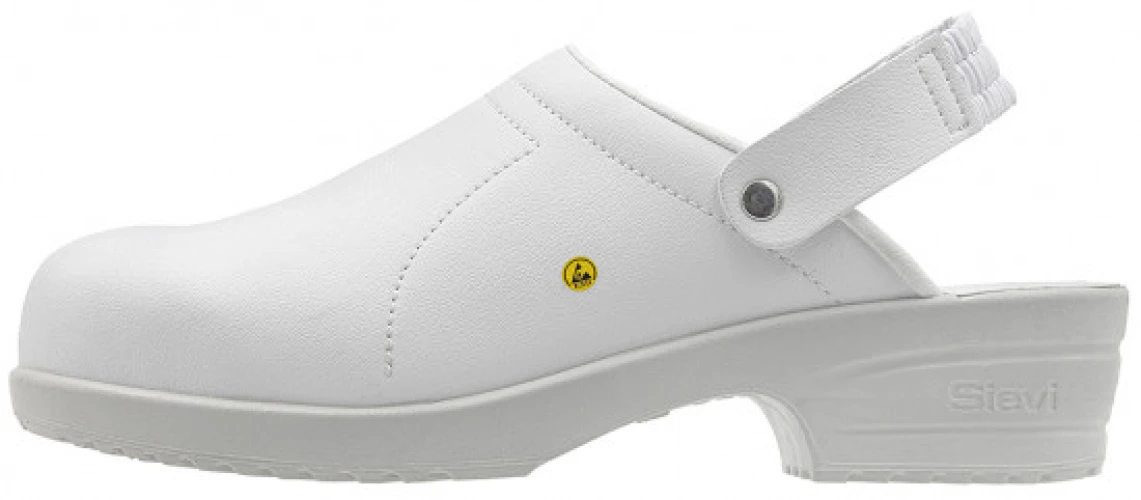 Modèle ESD classique et polyvalent de type sabot. Dessus en cuir-PU noir durable. Sangle de talon inversible avec élastique. Semelle en polyuréthane résistante à l’huile et à de nombreux produits chimiques.