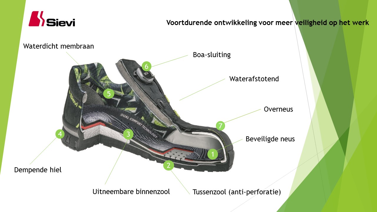 De voornaamste eigenschap van veiligheidsschoenen is de drager beschermen tegen ongevallen op het werk. De verschillende componenten van Sievi-veiligheidsschoenen en de daaruit resulterende vooruitstrevende werkveiligheid en het draagcomfort vormen een geheel dat in de praktijk meer is dan de som der delen.